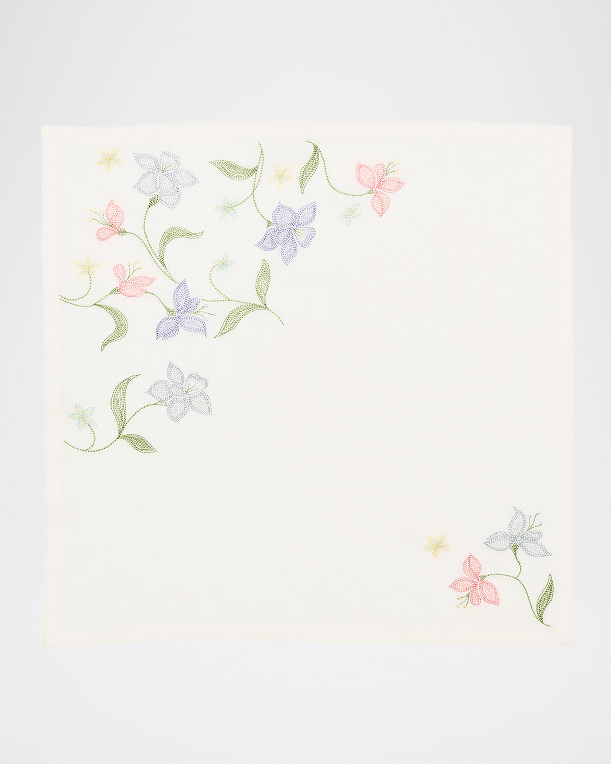The Vista napkin displays delicate handembroideries of sketched flowers scattering across your tablescape. This design staple expands your horizons for everyday dining, garden parties, and bridal luncheons, offering endless styling possibilities across the season. Made of linen Approx. 21"L x 21"W Do not dry clean. Machine wash cold with like colors. Machine dry low. Remove promptly. Steam iron while damp on reverse side. Do not bleach. Imported