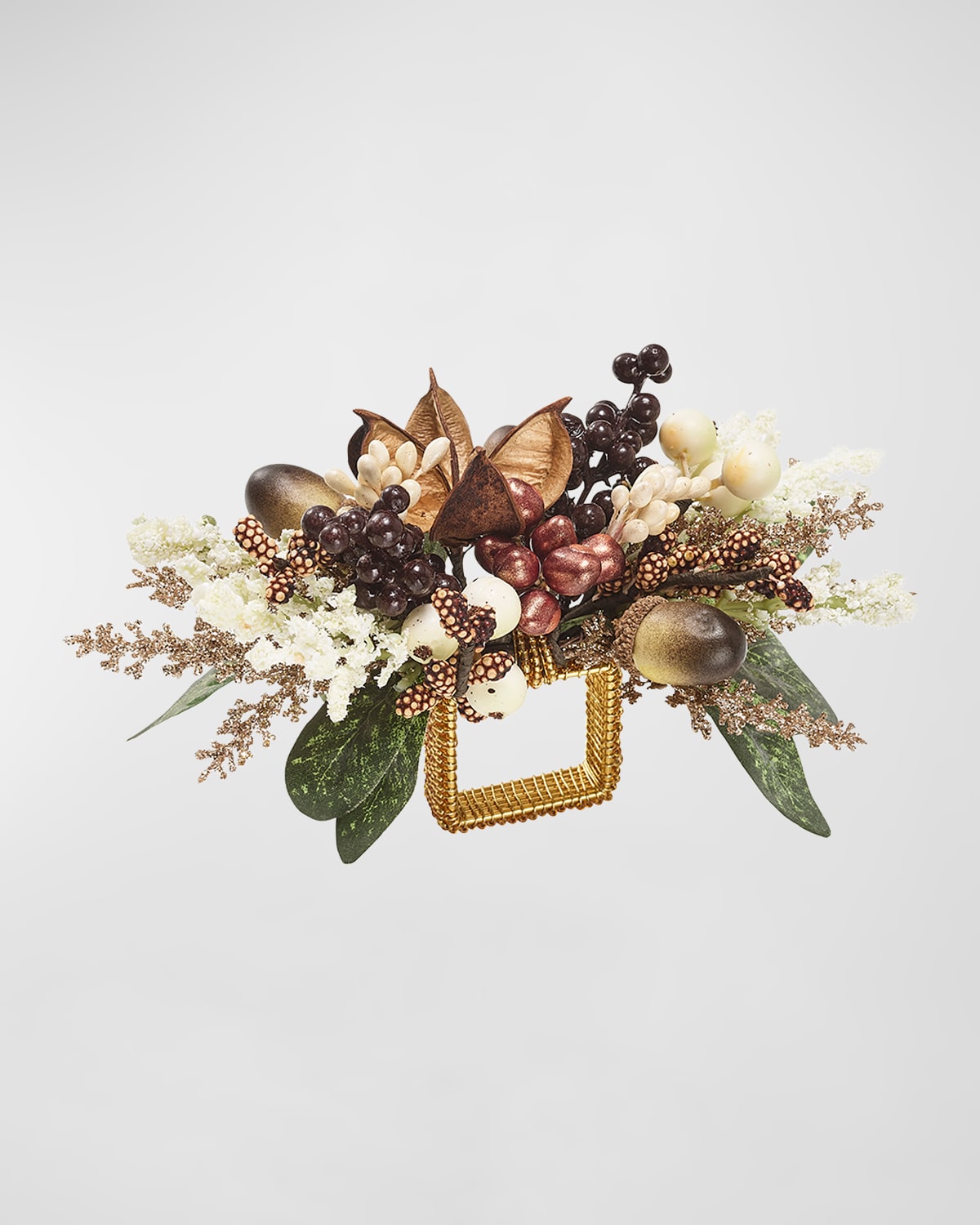 Napkin ring adorned with a fall foliageinspired spray Made of styrofoam, plastic, metal, glass beads, pinecones, and paper Approx. 7"L x 3.5"W x 3.5"T Wipe clean Imported