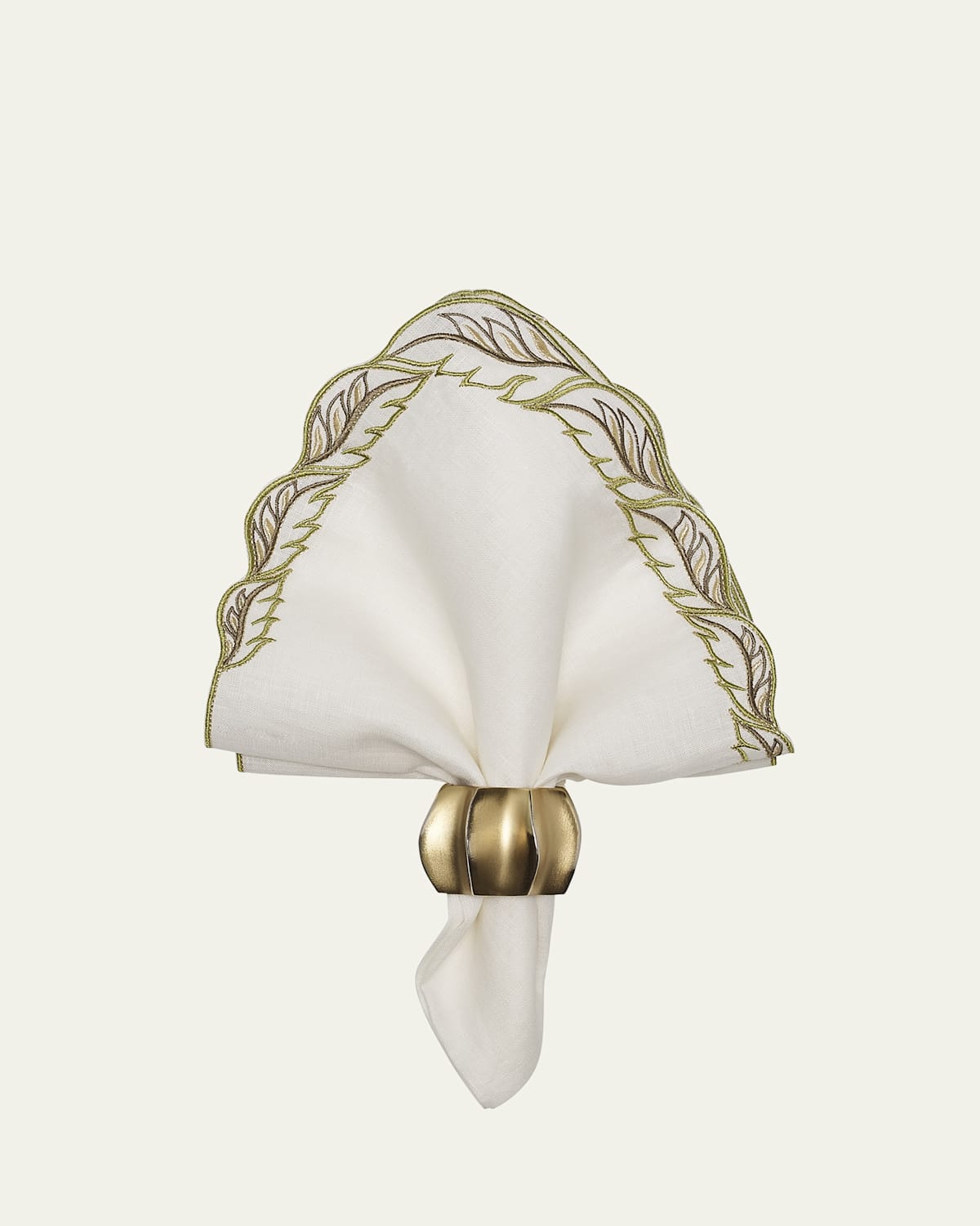 The Winding Vines Napkin is a nod to the rebirth that happens in spring. Embroidered intertwined leaves in green with metallic thread veining are applied asymmetrically on a linen base napkin, replicating the look of windblown vines. Use this napkin with the coordinating placemat or with other natureinspired pieces from their collection. Crafted of linen Approx. 21"Sq. Item Weight (Lbs.): 0.2 Imported