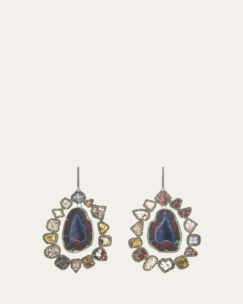 Kimberly McDonald earrings Approx. 2.6"L Polished 18karat solid gold White and yellow diamonds 16.66 total diamond carat weight Bezelset geode suspended from diamond slice black rhodium frame 13.00 total geode carat weight For pierced ears Made in USA