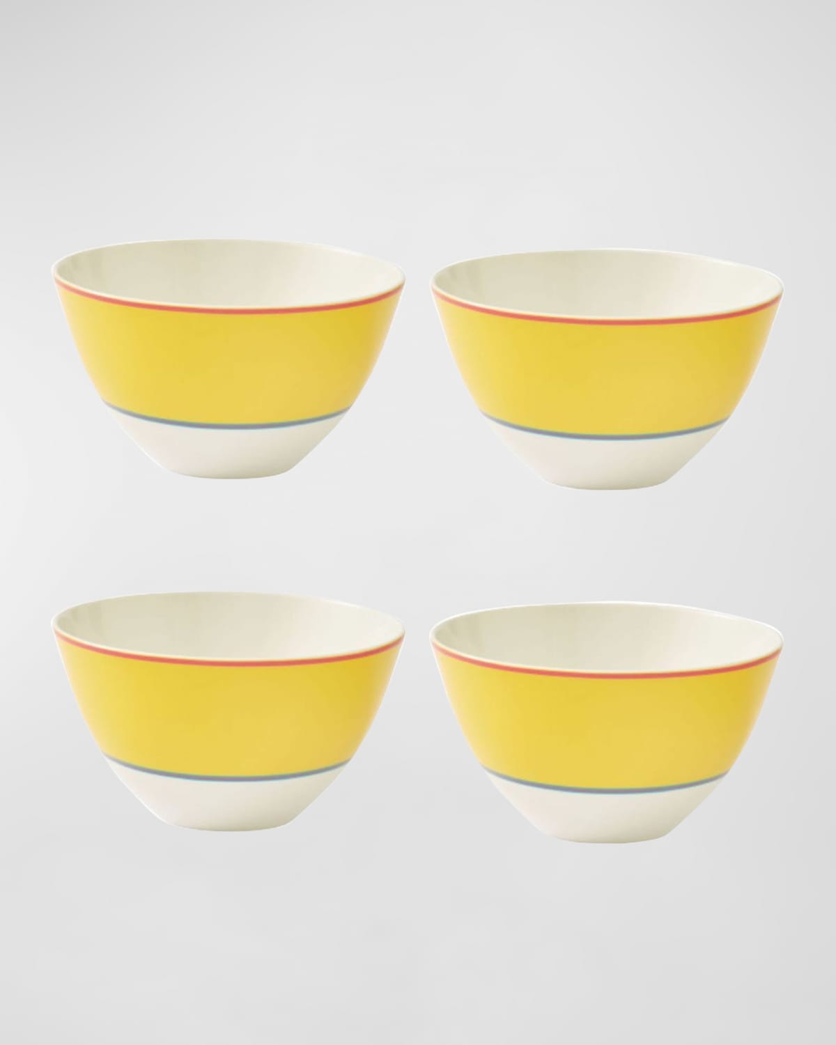 Bowls adorned with bright colorful border coordinates with other colors in the Calypso collection Made of porcelain 4piece set Approx. 6"L x 6"W x 3.4"T Item Weight (Lbs.): 0.9 Dishwasher and microwave safe Imported