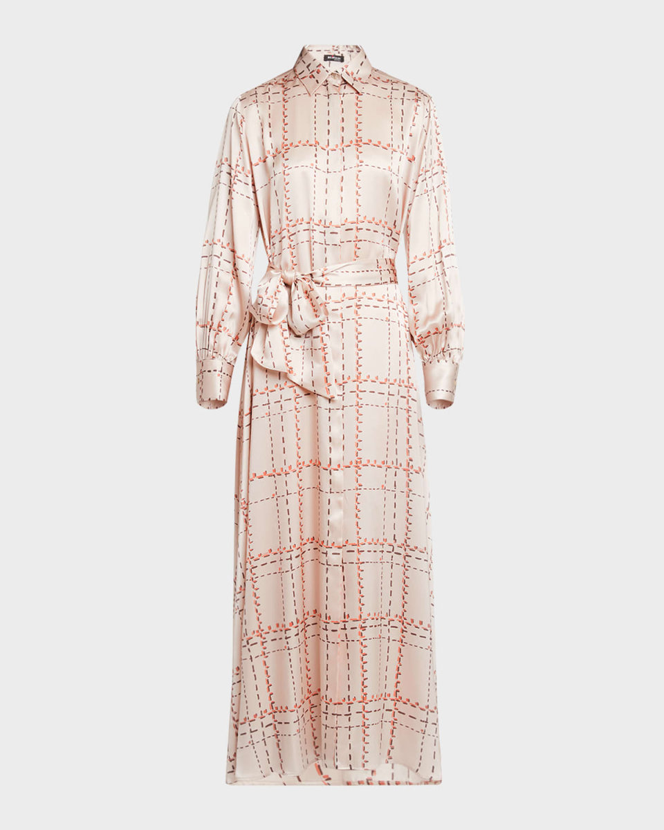 Kiton maxi dress in plaid charmeuse brings a soft menswear touch Spread collar; placket conceals button front for a sleek front Long sleeves; notched buttons cuffs Sash cinches the waist to create a polished, cohesive look Voluminous Aline silhouette Falls to the ankle Silk Made in Italy