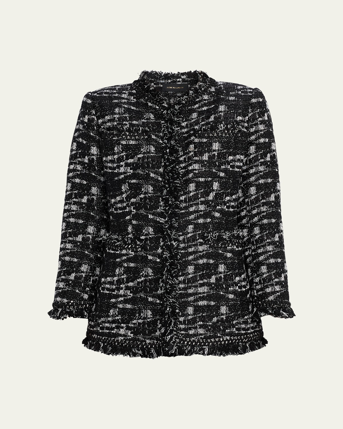 This Kobi Halperin "Gleb" jacket is crafted in a textured twotone heathered weave with braid and fringe trim Approx. 28"L from shoulders to hem Crew neckline Hookandeye front closure Padded shoulders Long sleeves Four patch pockets Slim fit Acrylic/cotton/polyester Made in France