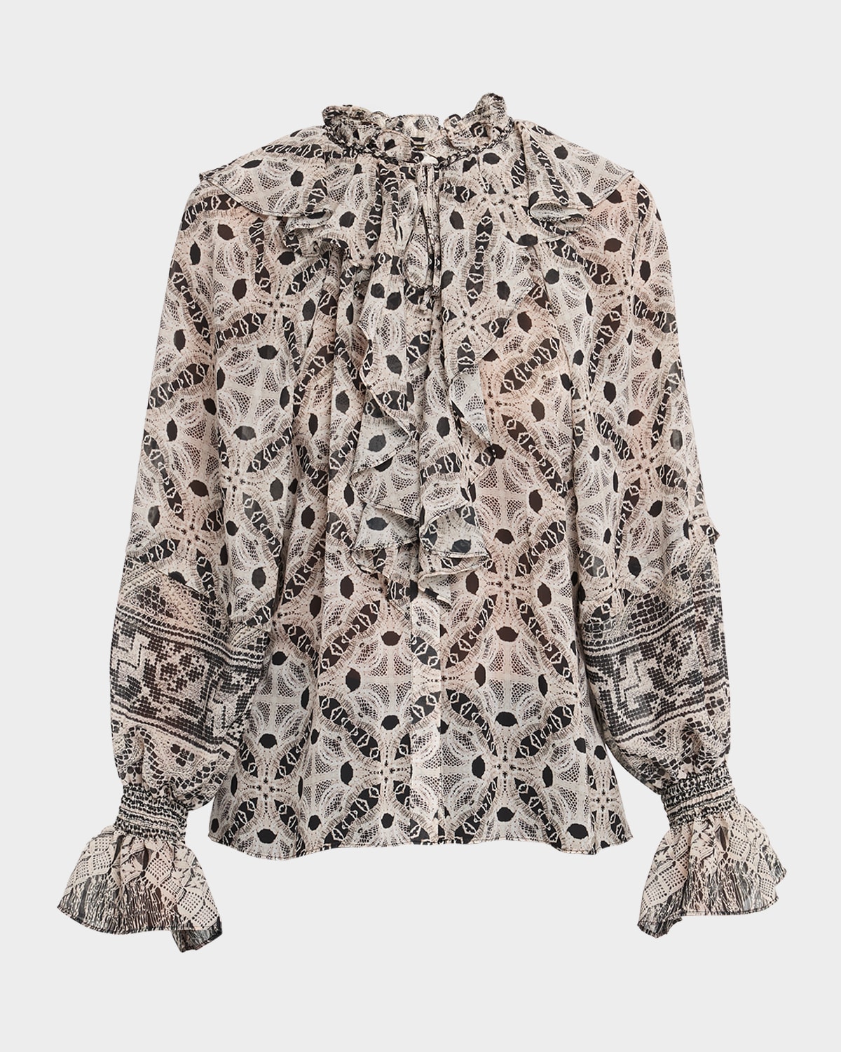 This Kobi Halperin "Glimmer" blouse features a geometric lace print with cascading ruffles adorning the front High neckline; neck selftie Concealed button front Long raglan blouson sleeves Elasticized ruffle cuffs Relaxed fit Polyester Imported