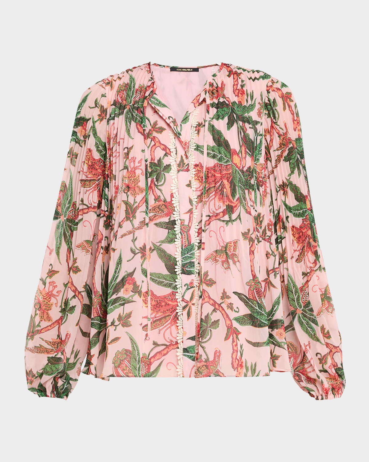 Kobi Halperin "Helen" pleated blouse in a floral print features delicate scalloped lace trim Approx. 26"L from shoulders to hem Crew neckline; front selftie Concealed button front Long blouson sleeves Elasticized cuffs Relaxed fit Polyester Lining: Polyester Dry clean Imported