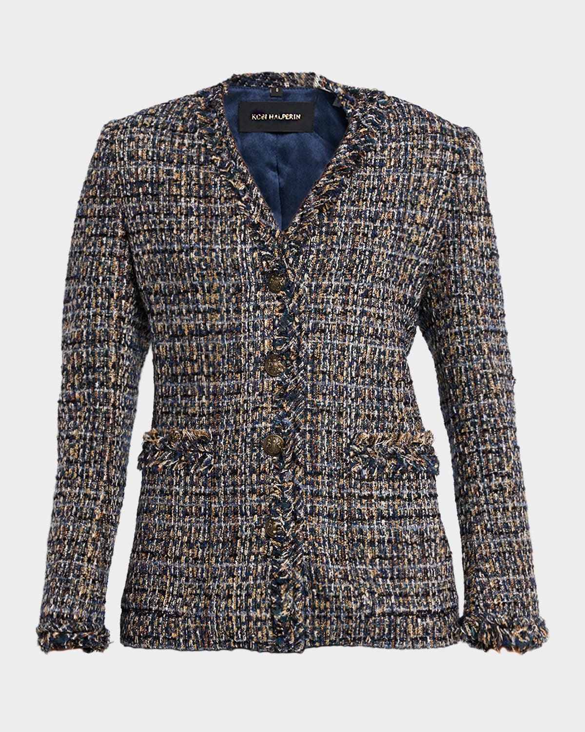 The Kobi Halperin "Kaden" jacket is crafted in a richly textured tweed, complete with fringe trim and goldtone buttons V neckline Button front closure Long sleeves Button cuffs Front patch pockets Relaxed fit Nylon/polyamide/polyester/wool Made in Italy