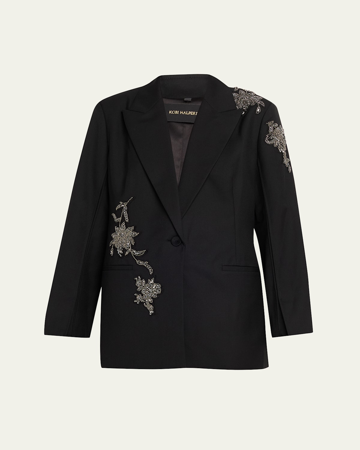 This "Lariz" jacket from Kobi Halperin is adorned with bead and crystalembellished floral appliqué Approx. 29.5"L from shoulders to hem Peak lapels; singlebutton front Long sleeves Front welt pockets Center back slit Relaxed fit Wool/polyester Imported
