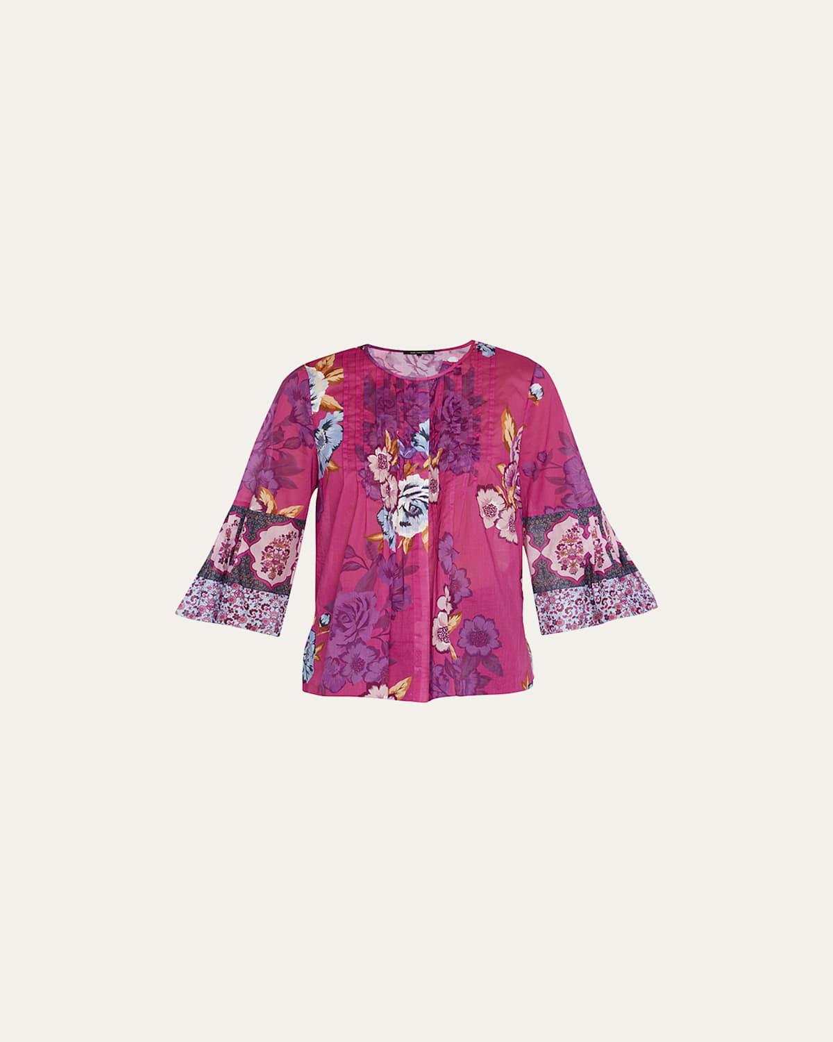 Kobi Halperin "Lee" floralprint blouse with pintuck details Approx. 26.5"L from shoulders to hem Scoop neckline; hidden button front 3/4 bell sleeves Relaxed fit Cotton Dry clean Imported