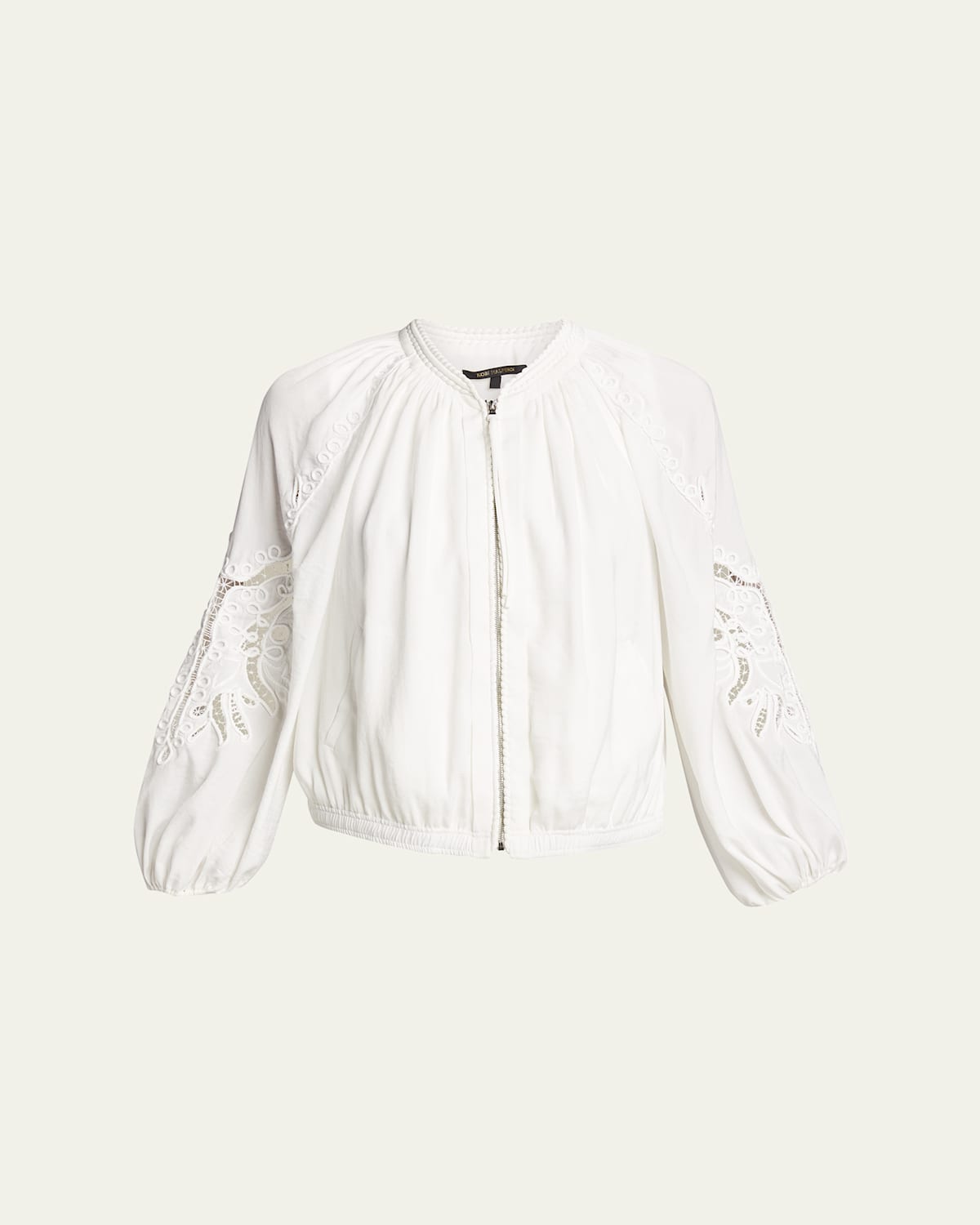 Kobi Halperin "Lenox" bomber jacket with eyelet sleeves and tonal embroidery Round neckline; zip front Blouson bracelet sleeves Welt side pockets Elastic cuffs and hem Relaxed silhouette Polyester self/lining Dry clean Imported