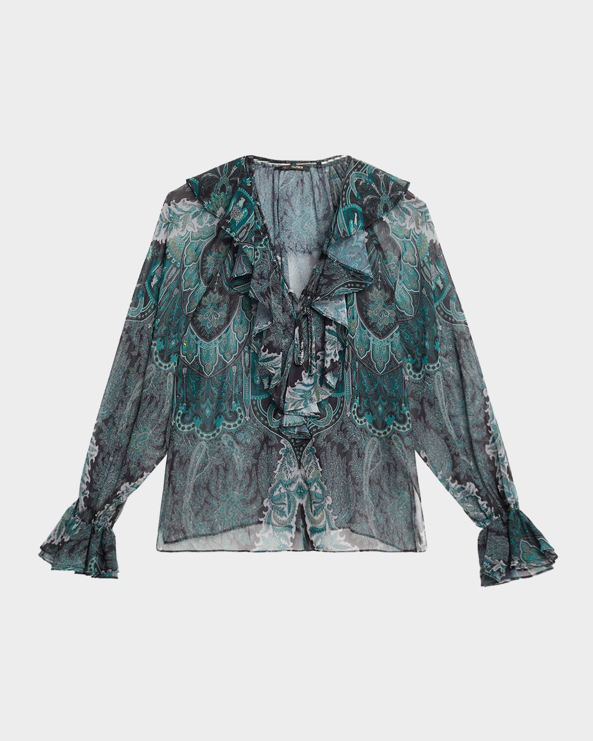 The "Locke" blouse from Kobi Halperin is printed with intricate cathedralesque florals and features flounces of cascading ruffles V neckline; front selftie Long blouson sleeves Elasticized ruffle cuffs Relaxed fit Polyester Made in Italy