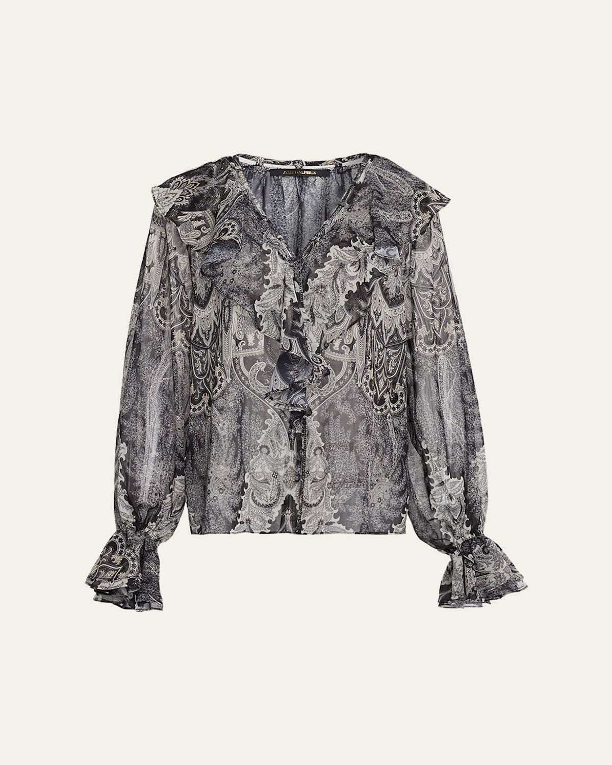 The "Locke" blouse from Kobi Halperin is printed with intricate cathedralesque florals and features flounces of cascading ruffles V neckline; front selftie Long blouson sleeves Elasticized ruffle cuffs Relaxed fit Polyester Made in Italy