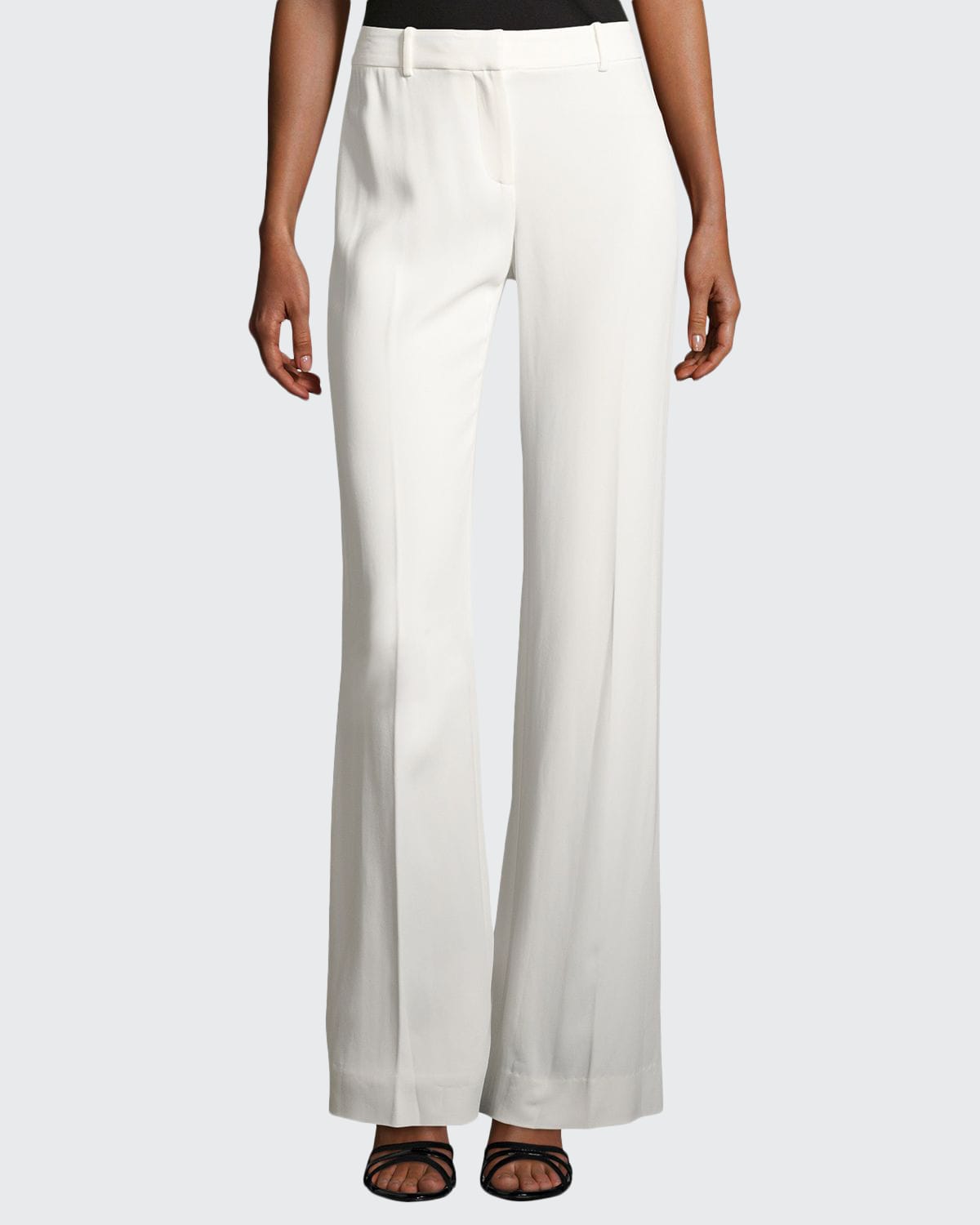 Kobi Halperin "Melina" creasedfront pants. Rise sits below the natural waist. Fitted through the seat. Wide legs fall from hips. Tab/zip front; belt loops. Viscose/spandex. Dry clean. Imported.