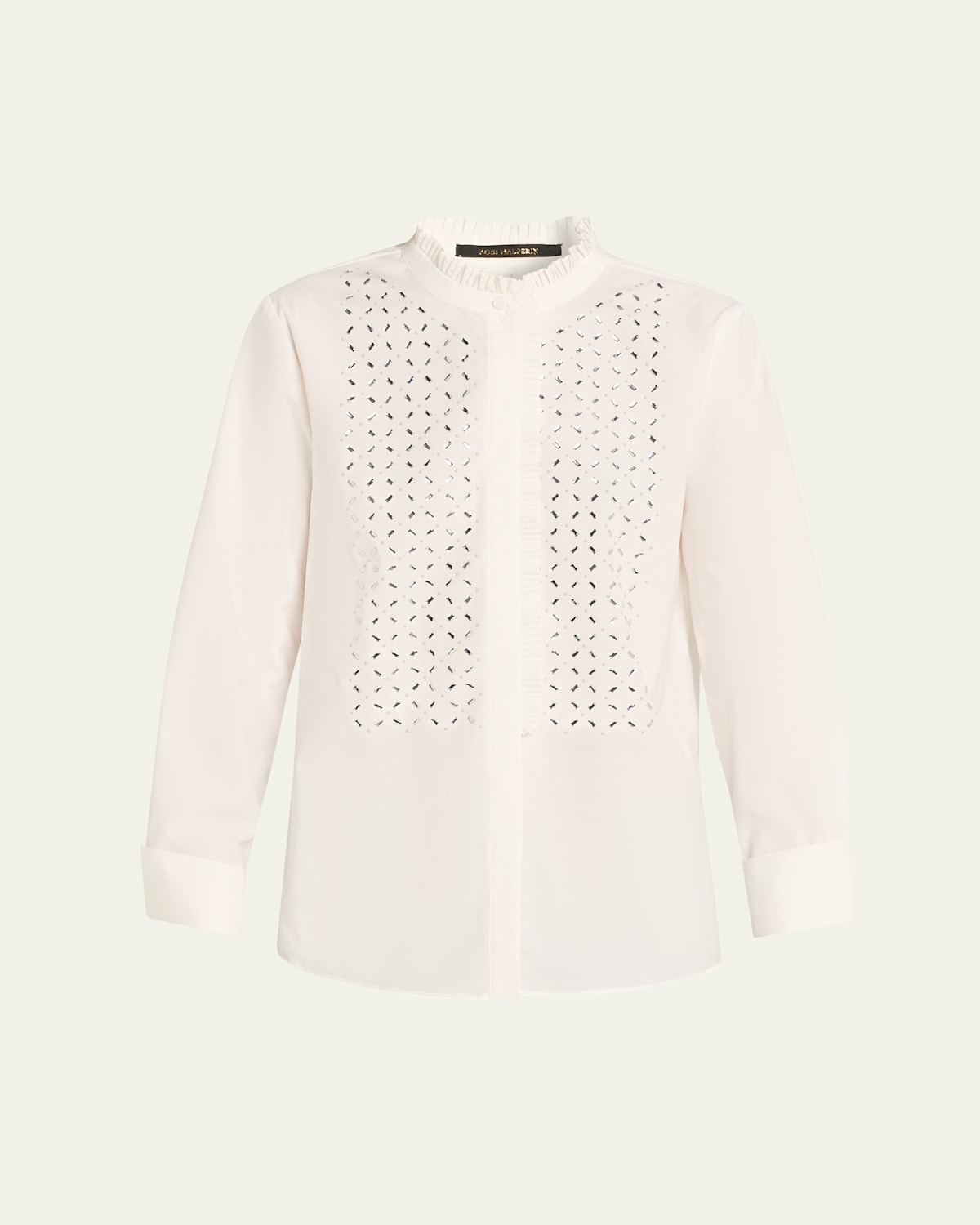Crafted in a crisp cotton blend, the "Mick" blouse from Kobi Halperin is adorned with glittering crystals and pearlescent accents. The neckline and button placket are trimmed with sophisticated pleated ruffles. Band collar Concealed button front Long sleeves Button cuffs Boxpleated back yoke Highlow sideslit hem Relaxed fit Cotton/polyester Imported