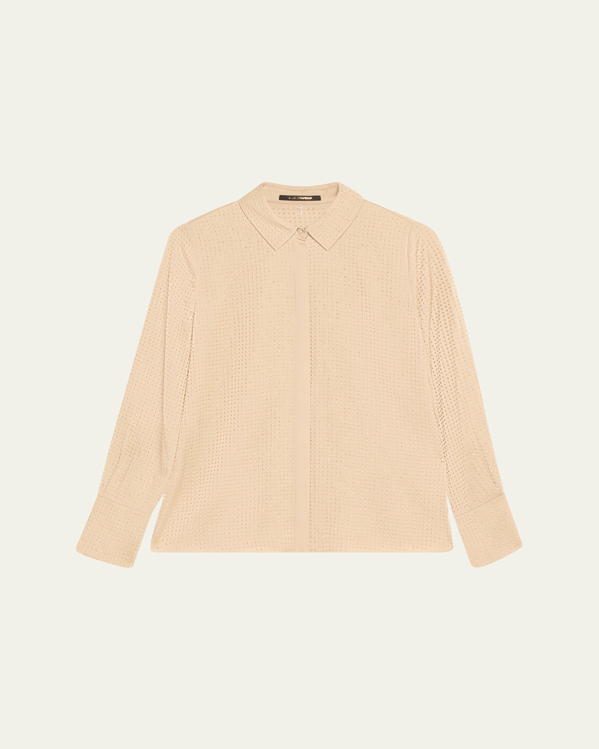 Kobi Halperin "Milani" blouse with allover metallic studs Approx. 26"L from shoulders to hem Point collar; concealed button front Long sleeves; button cuffs Hem side slits Relaxed fit Silk/spandex Dry clean Imported