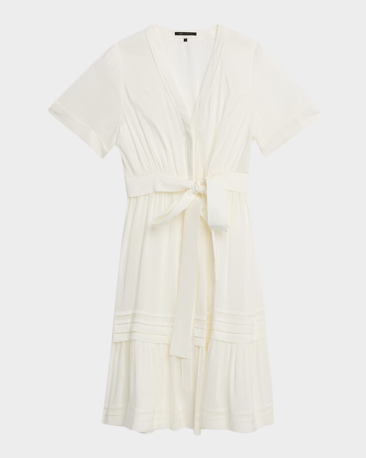 Made of a linen and silk blend, the Kobi Halperin "Miranda" midi dress is finished with ruching and tiered with pintuck ruffles Approx. 42.5"L from shoulders to hem V neckline Short sleeves Waist selftie Hem hits around the knee Aline silhouette Linen/silk Lining: Polyester Dry clean Imported