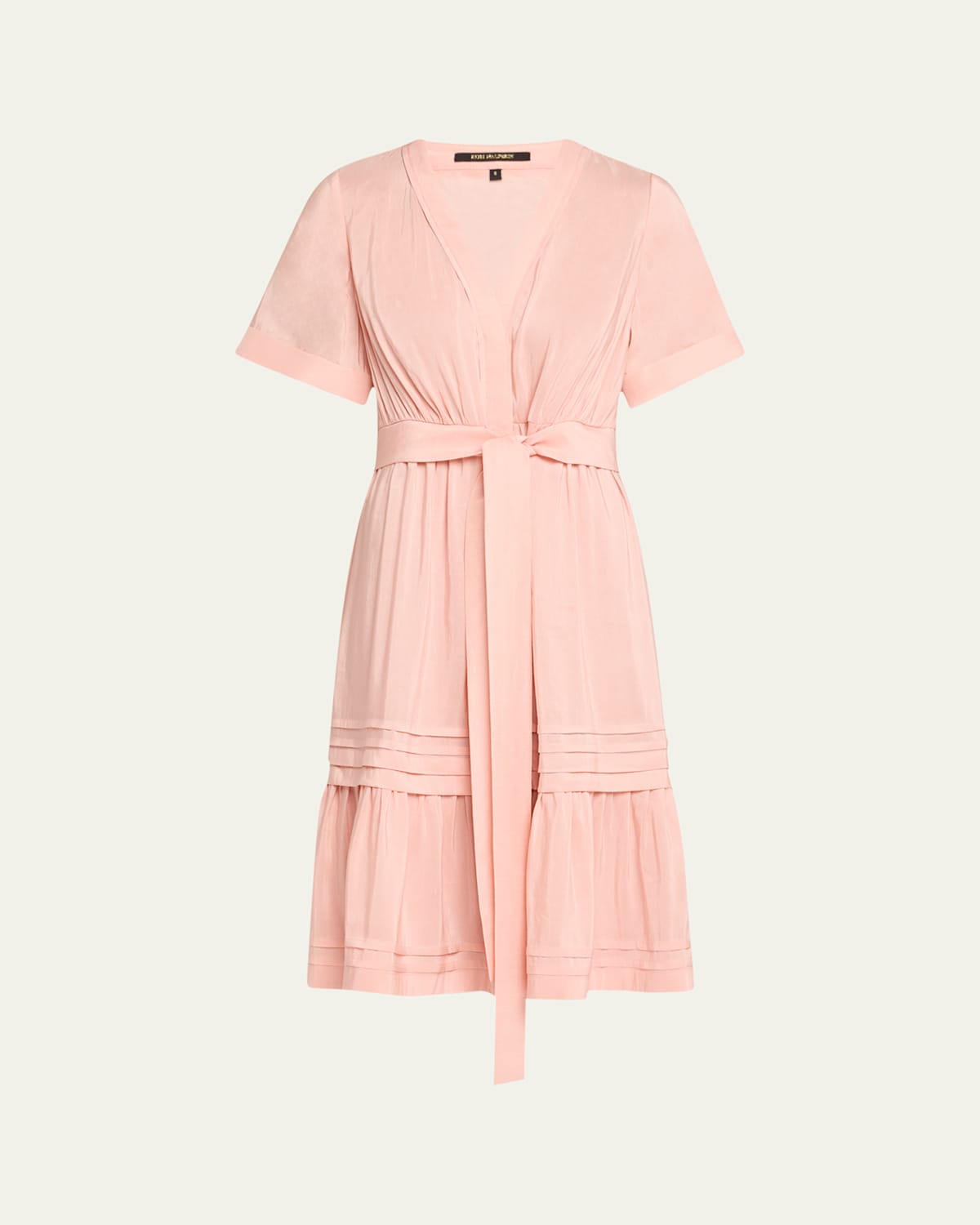 Made of a linen and silk blend, the Kobi Halperin "Miranda" midi dress is finished with ruching and tiered with pintuck ruffles Approx. 42.5"L from shoulders to hem V neckline Short sleeves Waist selftie Hem hits around the knee Aline silhouette Linen/silk Lining: Polyester Dry clean Imported