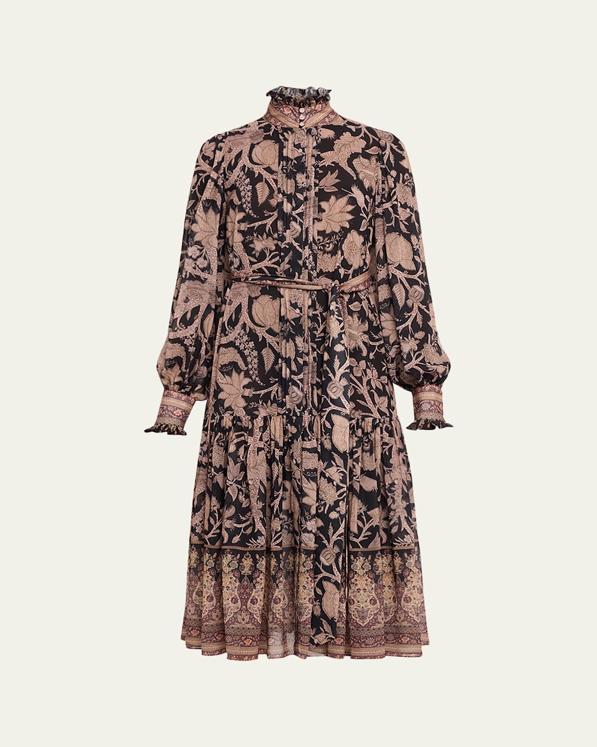 Printed with florals, this Kobi Halperin "Moses" midi dress is detailed with front pintucks and ruffles along with cuffs and collar High collar; concealed button front Long balloon sleeves Button cuffs Ruched back Waist selftie Hem falls below the knee Aline silhouette Polyester Imported