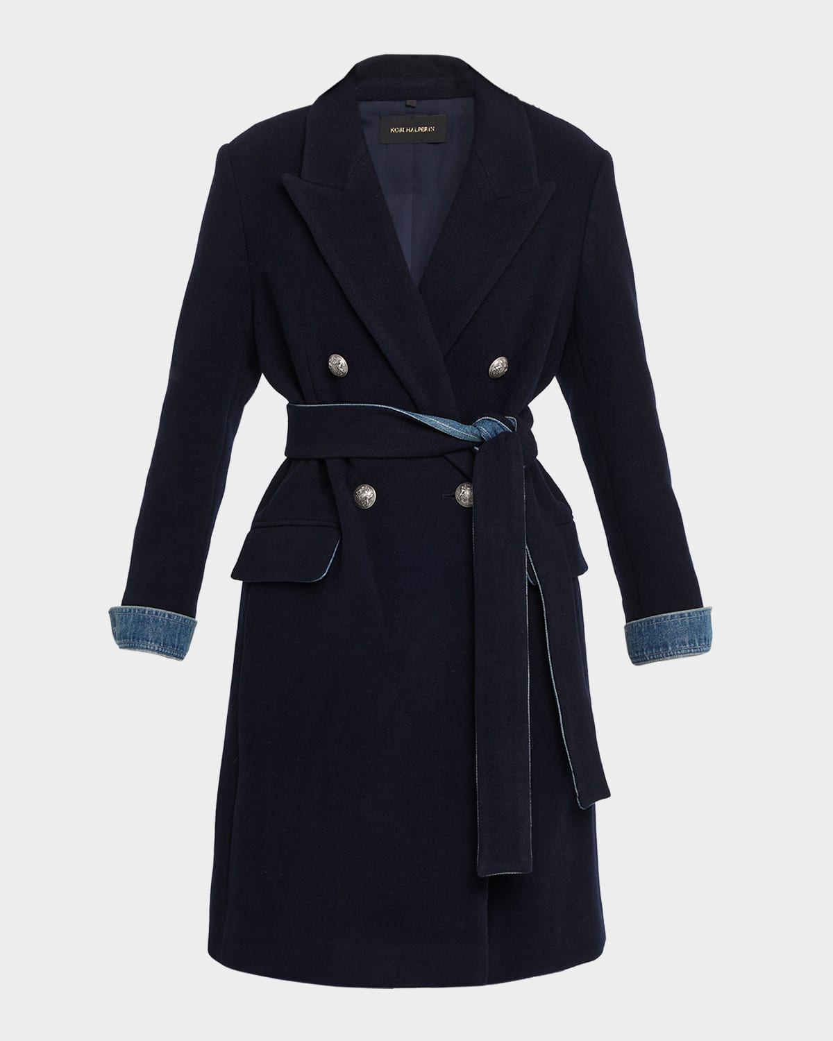 Crafted in wool, the Kobi Halperin "Otto" coat features contrast denim lining on the cuffs, collar, flap pockets, and waistdefining selftie Peak lapels; doublebreasted front Long sleeves Button cuffs Front flap pockets Center back slit Hem falls above the knee Aline silhouette Wool Imported