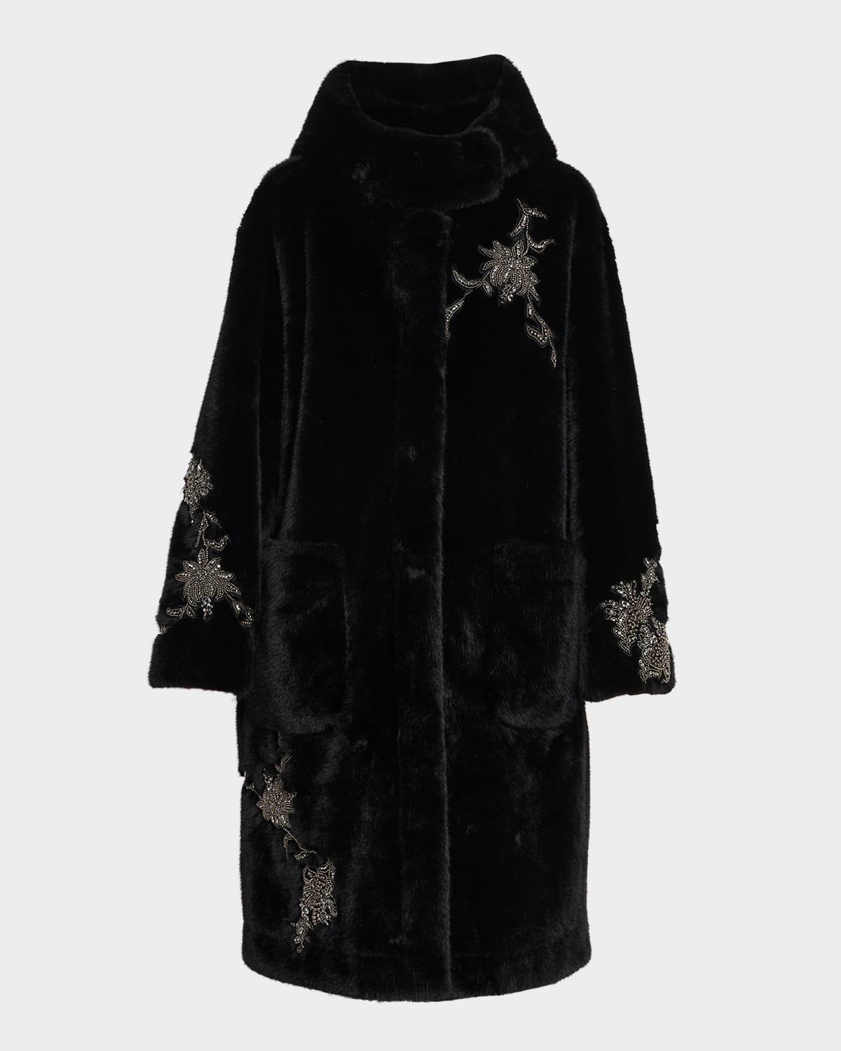Crafted in soft faux fur (polyester), this Kobi Halperin "Peggy" coat is adorned with bead and crystalembellished floral appliqué Light beige colorway: Stand collar Black colorway: Hooded collar Long sleeves Hip patch pockets Hem hits around the knee Straight silhouette Polyester Imported