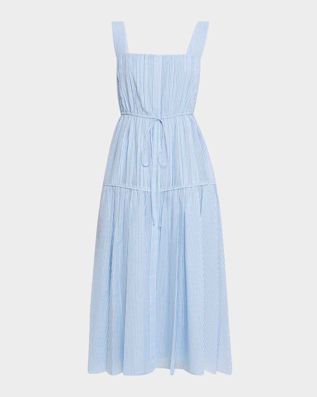 Kobi Halperin "Reina" tiered midi dress with horizontal stripes Approx. 41"L from shoulders to hem Square neckline Sleeveless Drawstring waist selftie Midback smocking Hem falls below the knee Aline silhouette Invisible side zipper Cotton/silk Lining: Polyester Dry clean Imported