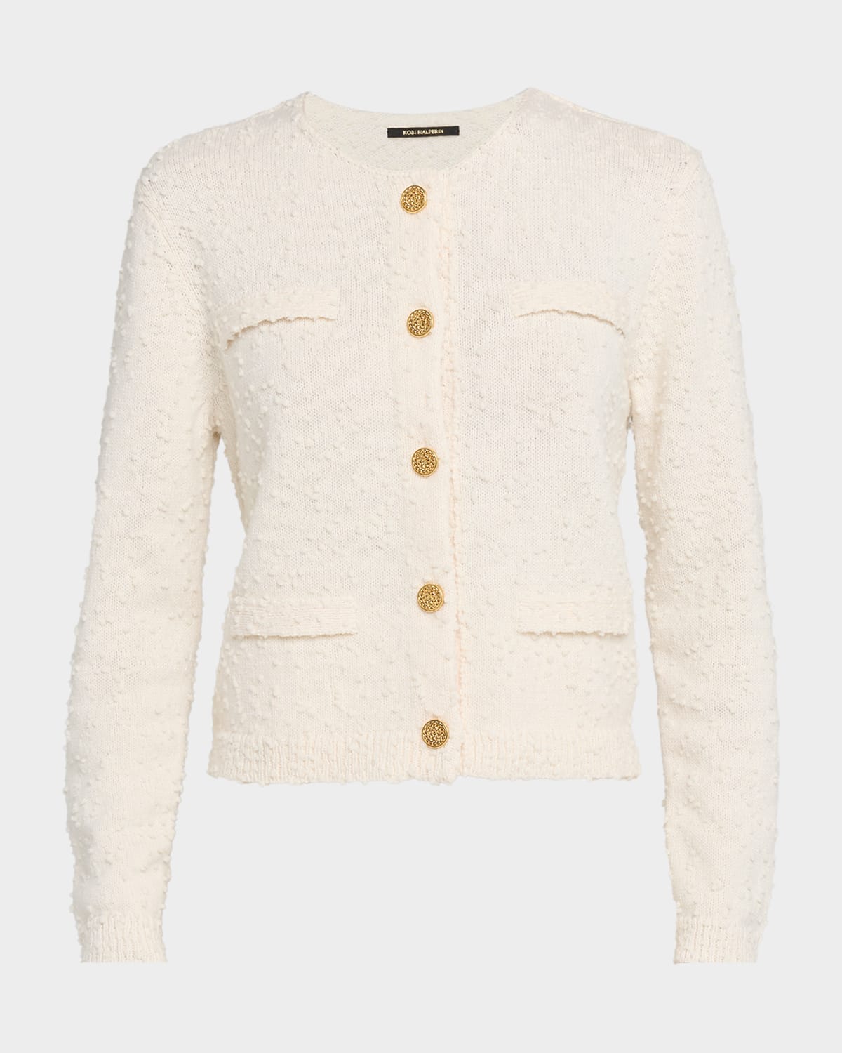 The Kobi Halperin "Richie" sweater is knit in wool with irregular pompom texture dotted throughout Crew neckline Button front closure Long sleeves Faux welt pockets Relaxed fit Wool Imported