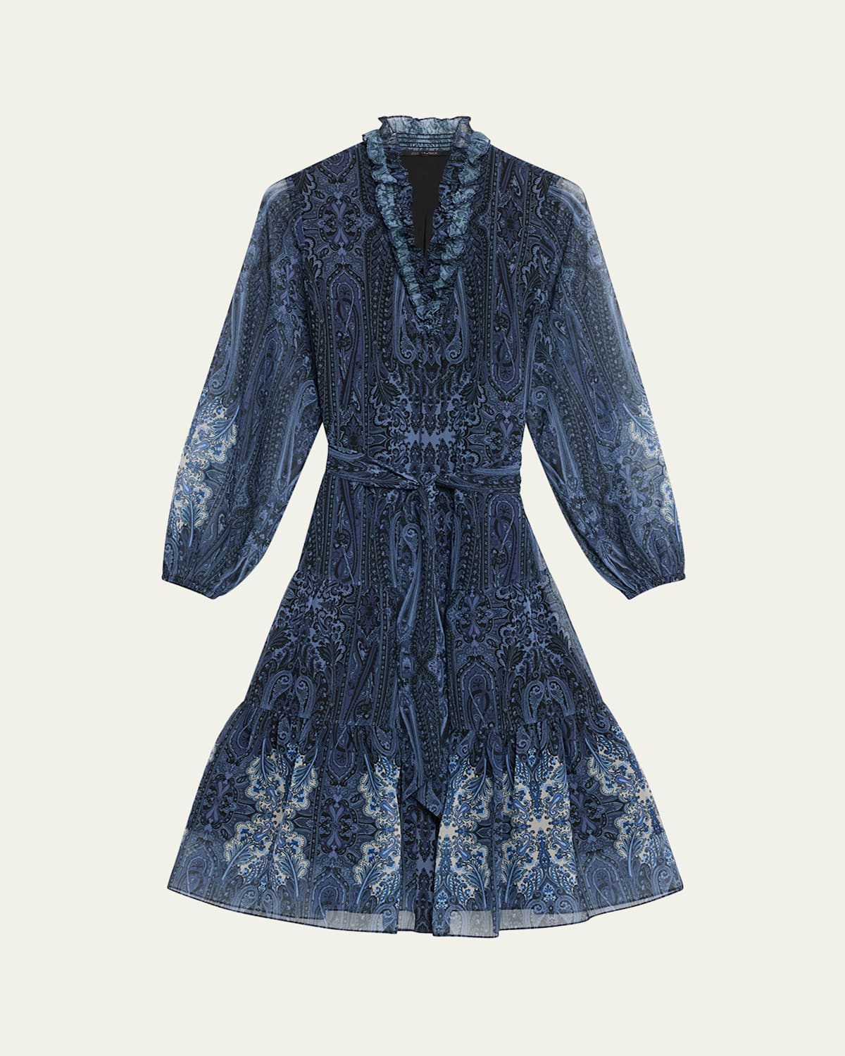 Kobi Halperin "Verena" tiered midi dress in a swirling floral print with ruffle trim Approx. 45.5"L from shoulders to hem V neckline Long blouson sleeves Elasticized cuffs Waist selftie Hem falls below the knee Aline silhouette Polyester Lining: Polyester Dry clean Imported