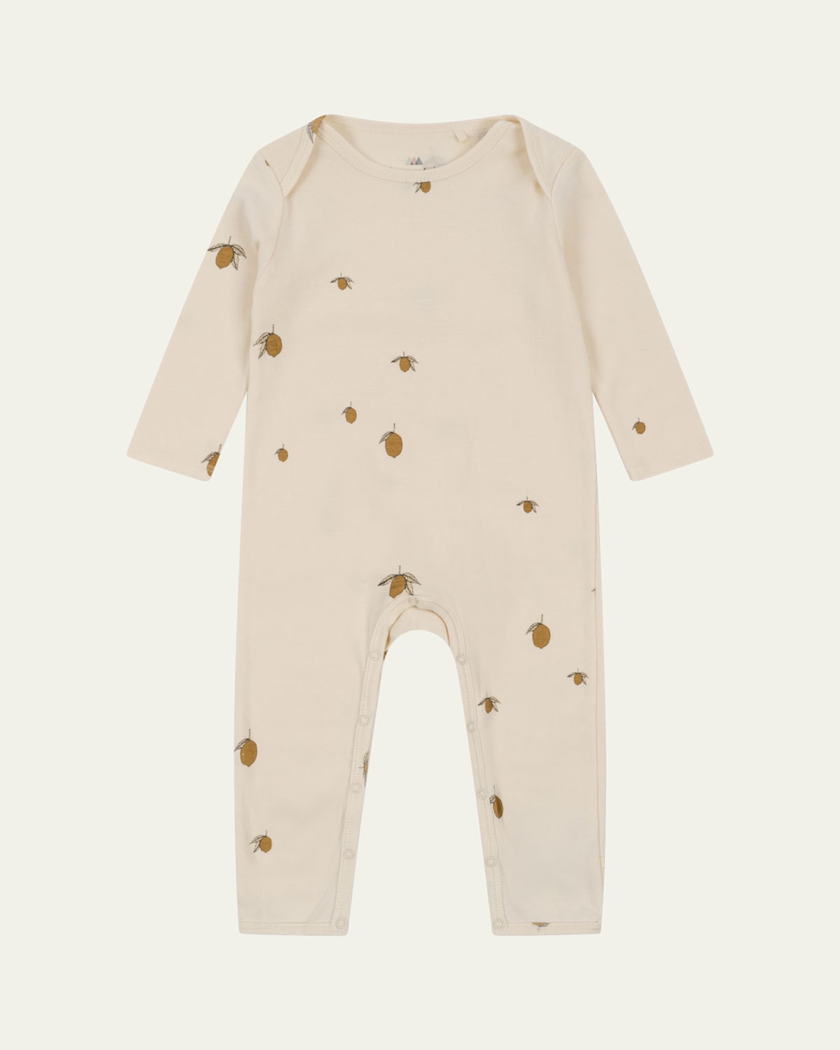 Konges Sløjd coverall crafted from soft cotton jersey fabric in a fruit motif design Crew neckline Envelope shoulders Long sleeves Full length Snaps through legs Organic cotton Imported