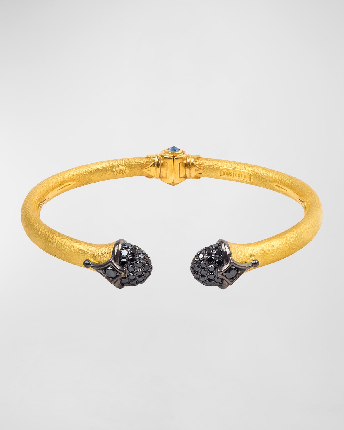 Konstantino bracelet with pavé diamonds. 18karat yellow gold hardware. One bezelset sapphire at hinge. Domed ends with black diamonds. 0.27 total sapphire carat weight. 1.263 total diamond carat weight. Hinged opening eases dress. Handcrafted in Greece.