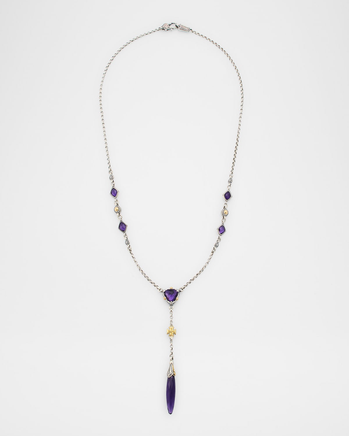 Konstantino statement necklace from the Anthos Collection Necklace length: approx. 22 inches (Adjustable) Sterling silver and 18karat yellow gold Mixcut dark amethyst quartz Lobster clasp Made in Greece