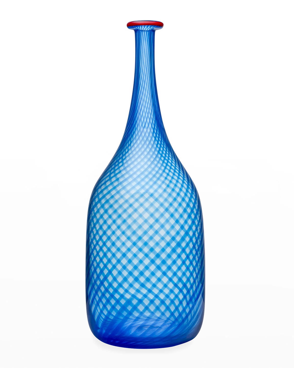 Blue bottle with red rim. Made of colored glass. Approx. 6.25"Dia. x 15.75"T. Imported.