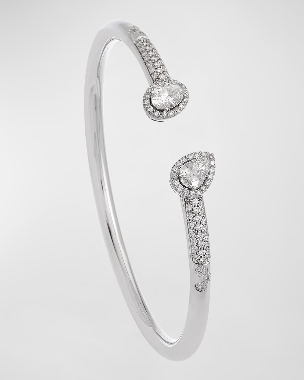 Krisonia cuff bracelet Polished 18karat white gold Pear and ovalcut diamond tips Pavé roundcut diamonds 1.63 total diamond carat weight Approx. 2.2"W x 1.8"H Made in Italy