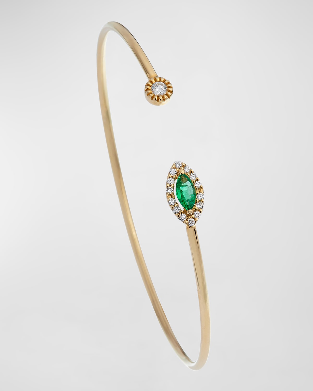 Krisonia bracelet Polished 18karat yellow gold Marquise emerald with a diamond halo Opposite end with one white diamond Diamond total carat weight: 0.18 Slipon style Approx. 2.2"W x 1.8"H Made in Italy