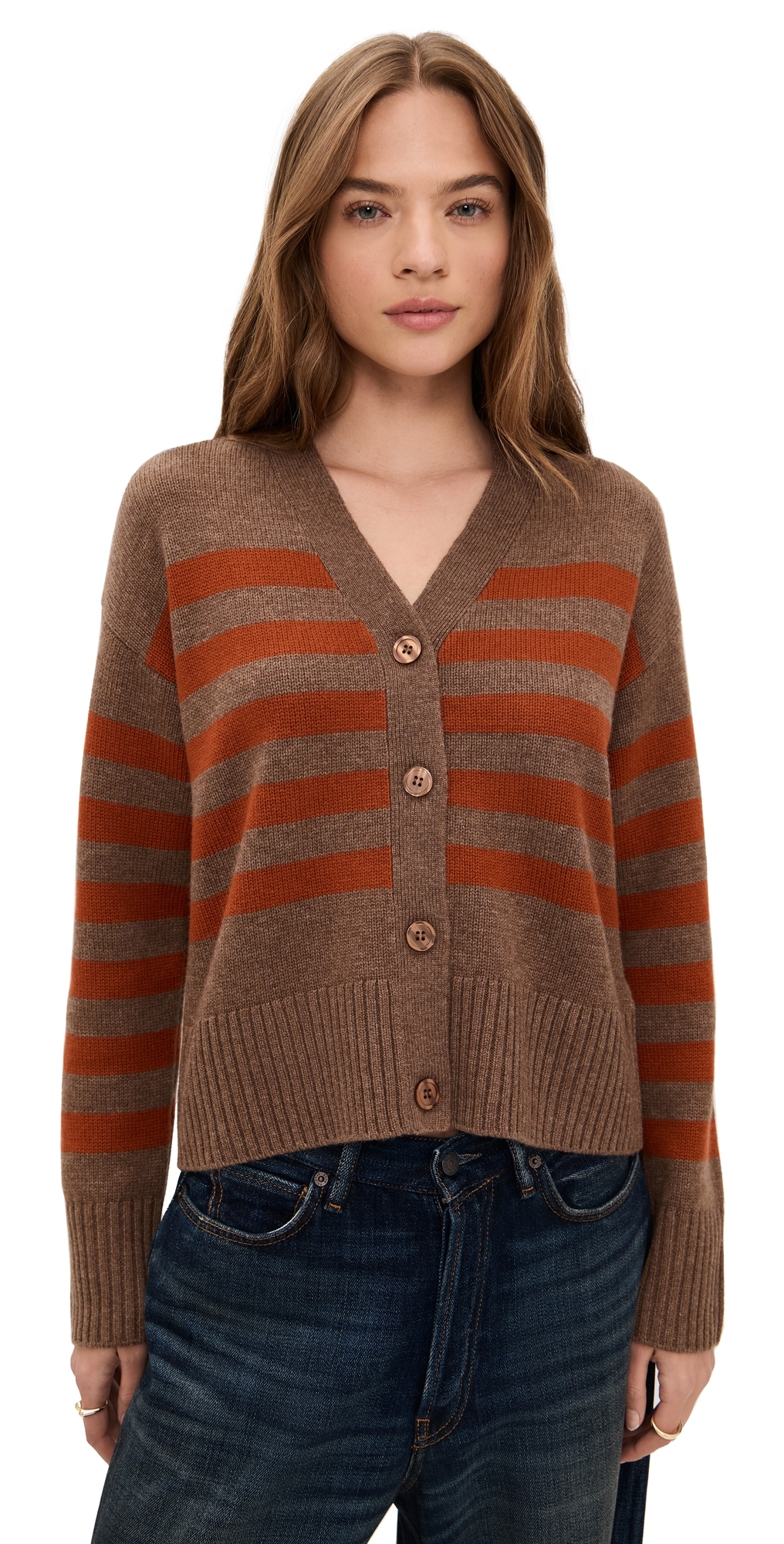 Fabric: Mid-weight stretch knit. Stripe pattern and ribbed edges. V neck. Long sleeves. Button placket. Shell: 70% wool/30% cashmere. Dry clean. Imported, China. Measurements: Measurements from size XS Length: 22in / 56.0cm, from shoulder