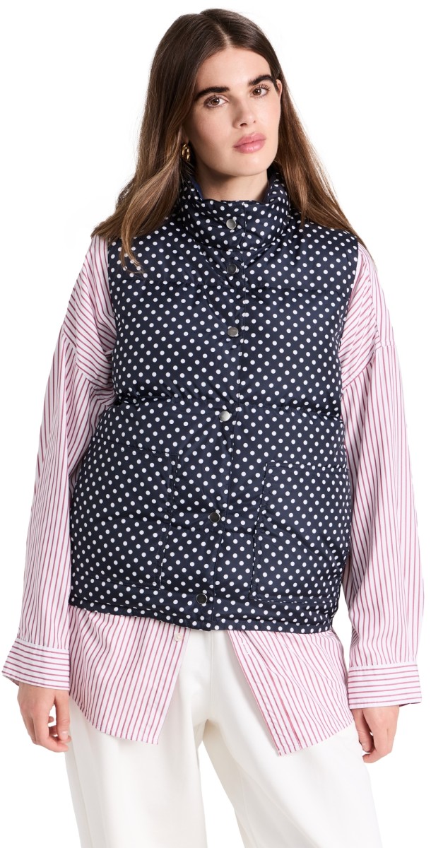 Fabric: Mid-weight, technical weave. High neck and button placket. Polka dot print. Reversible design. Patch front and interior pockets. Shell: 100% polyester. Lining: 100% nylon. Fill: 90% duck down/10% feathers. Dry clean. Imported, China. Measurements: Measurements from size M Length: 24in / 61.0cm, from shoulder to front hem Length: 26in / 66.0cm, from shoulder to back hem