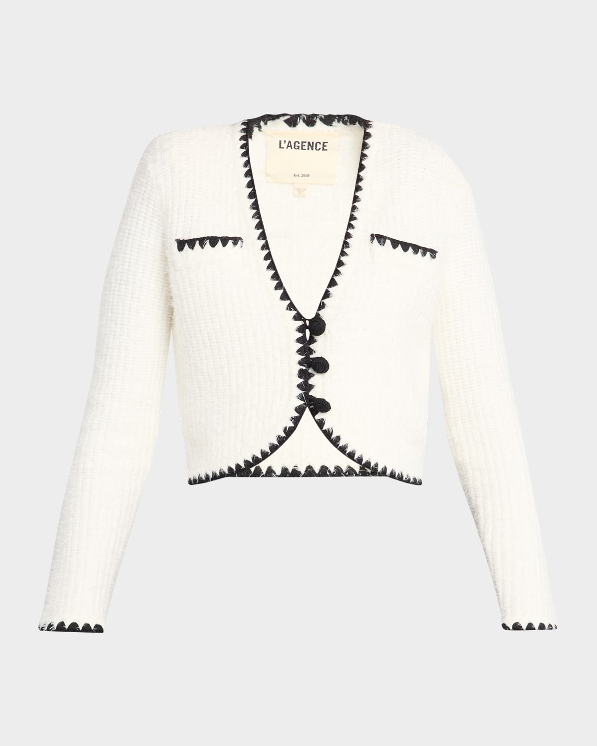 Crafted from an eyelash knit with contrasting crochet trim, the "Anaya" cardigan by L'Agence features faux chest pockets for a tailored finish V neckline Padded shoulders Long sleeves Cropped length Waistdefining curved hem Buttonandloop front closure Amni® nylon/cotton/acrylic Imported