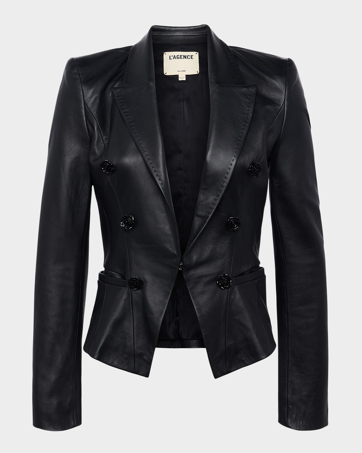 L'Agence "Andalusia" luscious lambskin leather blazer finished with tonal roseshaped decorative buttons Peak lapels; front hook closure Strong padded shoulders Long sleeves; button cuffs Front welt pockets Hip length Tailored fit Leather Dry clean Imported