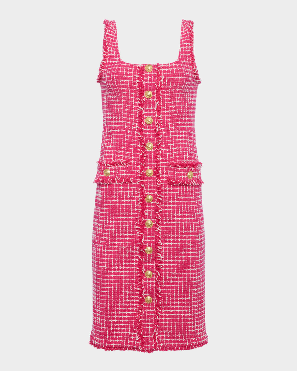 L'Agence "Aya" dress crafted from textured Italian tweed with strategic seaming to sculpt the figure Square neckline; decorative middle buttons Sleeveless Welt pockets Hem hits around the knee Aline silhouette Back invisible zip with hookandeye closure Cotton/polyester Dry clean Imported