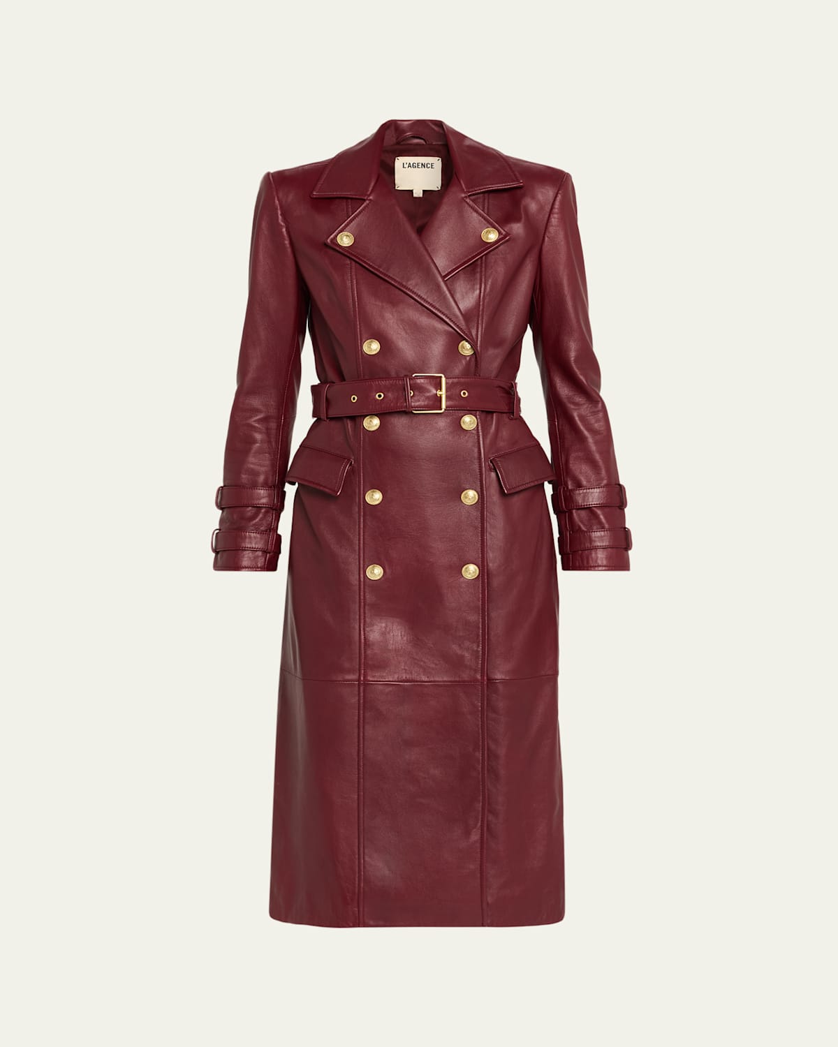 L'Agence "Celina" smooth calfskin leather trench coat accented with golden embosseddome buttons Approx. 47"L from shoulder to hem Notched collar; doublebreasted front Long sleeves with belted zip cuffs; approx. 24"L Waist flap pockets Hem falls below the knee Leather Dry clean Imported