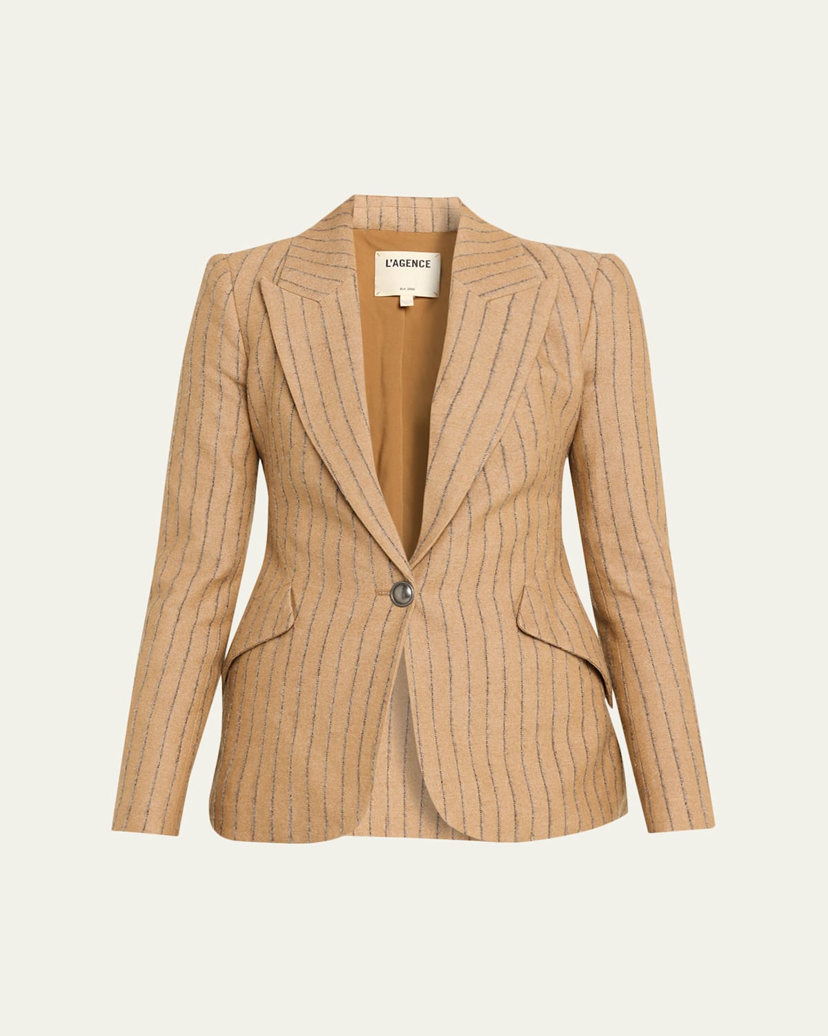 Crafted from a classic textured suiting fabric, the "Chamberlain" blazer by L'Agence features vertical pinstripes for a figurelengthening effect Approx. 27.5"L from shoulder to hem Peal lapels; singlebreasted front Padded shoulders Long sleeves; button cuffs Angled hip flap pockets Doublevented back Tailored fit Viscose/polyester/cotton Imported