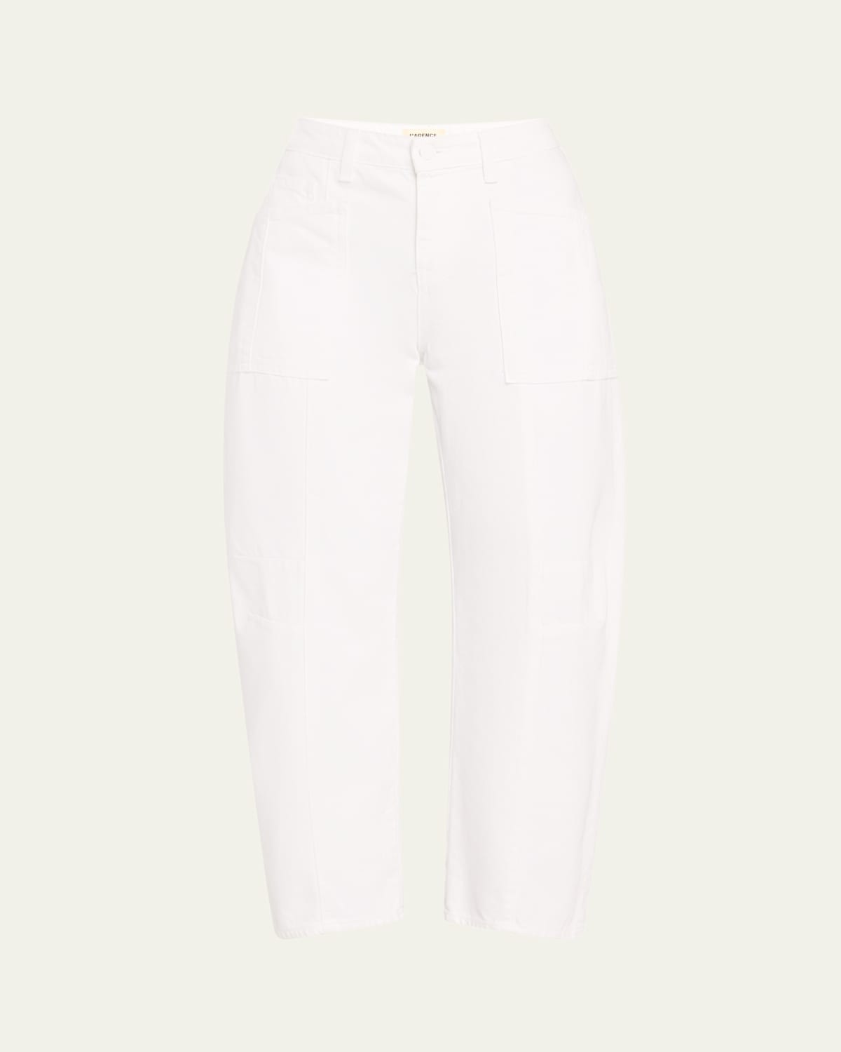 L'Agence "Cody" rodeo jeans in white denim Approx. 11" rise; 26" inseam High rise Fivepocket style Loose, curved legs Cropped length Button/zip fly; belt loops Cotton Made in USA