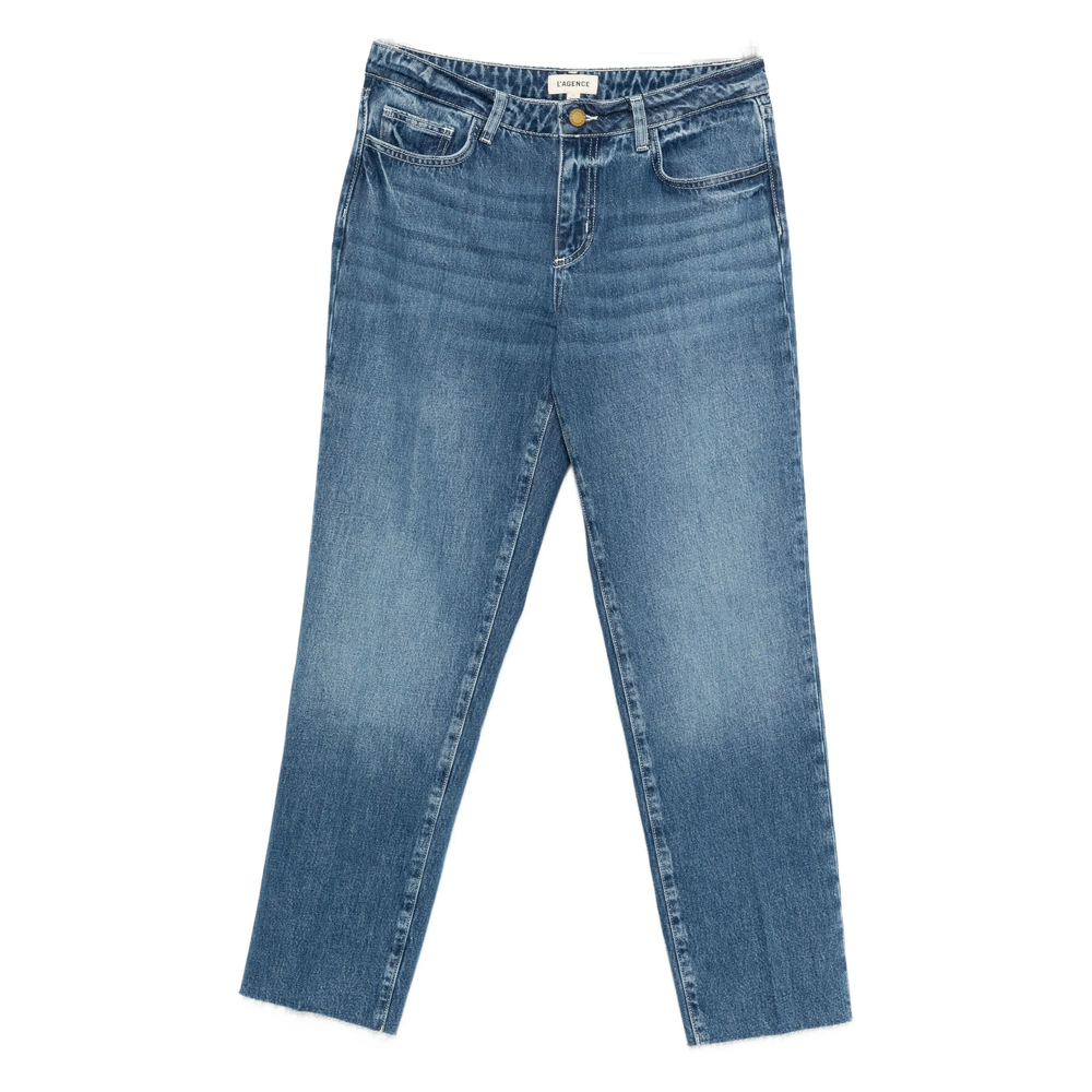 blue frayed hem five pockets belt loops button fastening contrast stitching
