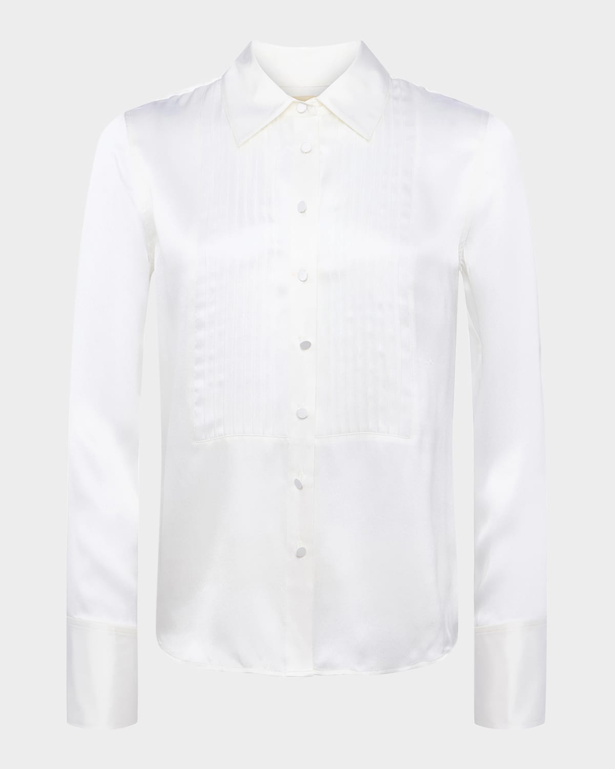 L'Agence "Divya" lustrous silk tux shirt with a front pintuck bib panel Spread collar; button front Long sleeves; button cuffs Yoked back Hip length Relaxed fit Silk Dry clean Imported