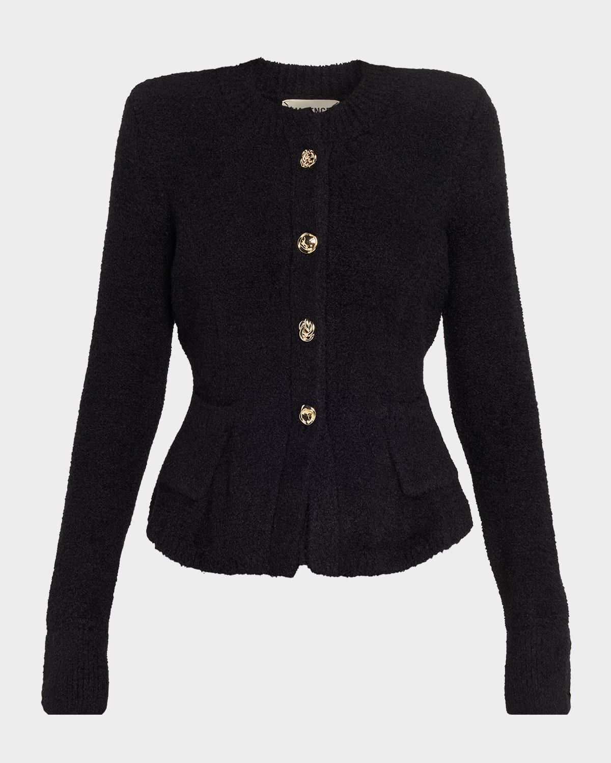 Spun in a textured knit, the "Melissa" cardigan by L'Agence boasts an elegant sculpted waist and flared hem for a figuredefining silhouette Crew neckline; button front Padded shoulders Long sleeves; button cuffs Hip patch pockets Slim fit Hip length Amni® nylon/Lycra xfit® spandex Imported