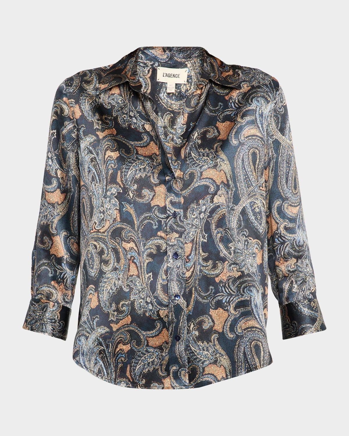 L'Agence "Dani" luxurious silk charmuese blouse decorated with a multietched paisley pattern Point collar; buttonfront Threequarter sleeves with button cuffs Relaxed fit Hip length Highlow shirttail hem Silk Imported