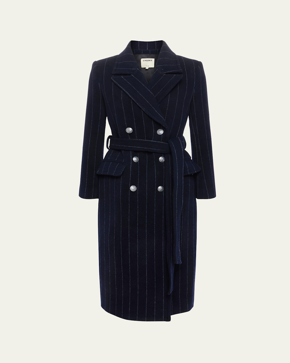 L'Agence "Olina" pinstriped woolblend trench coat Peak lapels; doublebreasted front Strong padded shoulders Long sleeves Selftie belt through belt loops Hip flap pockets Centercut back vent Hem falls below the knee Straight fit Wool/nylon/polyamide Imported