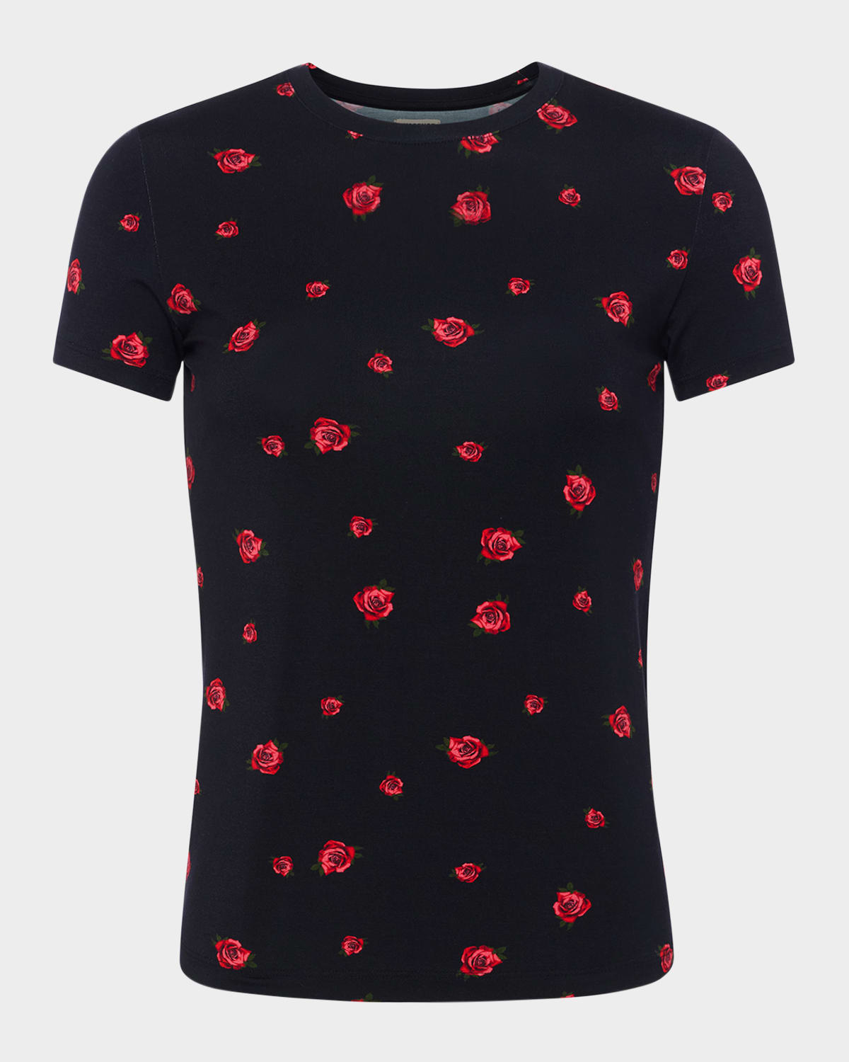 L'Agence "Ressi" classic tee featuring a rose motif Crew neckline Short sleeves Fitted silhouette Hem sits at the hip Pullover style Promodal® rayon/Lycra xfit® spandex Made in USA