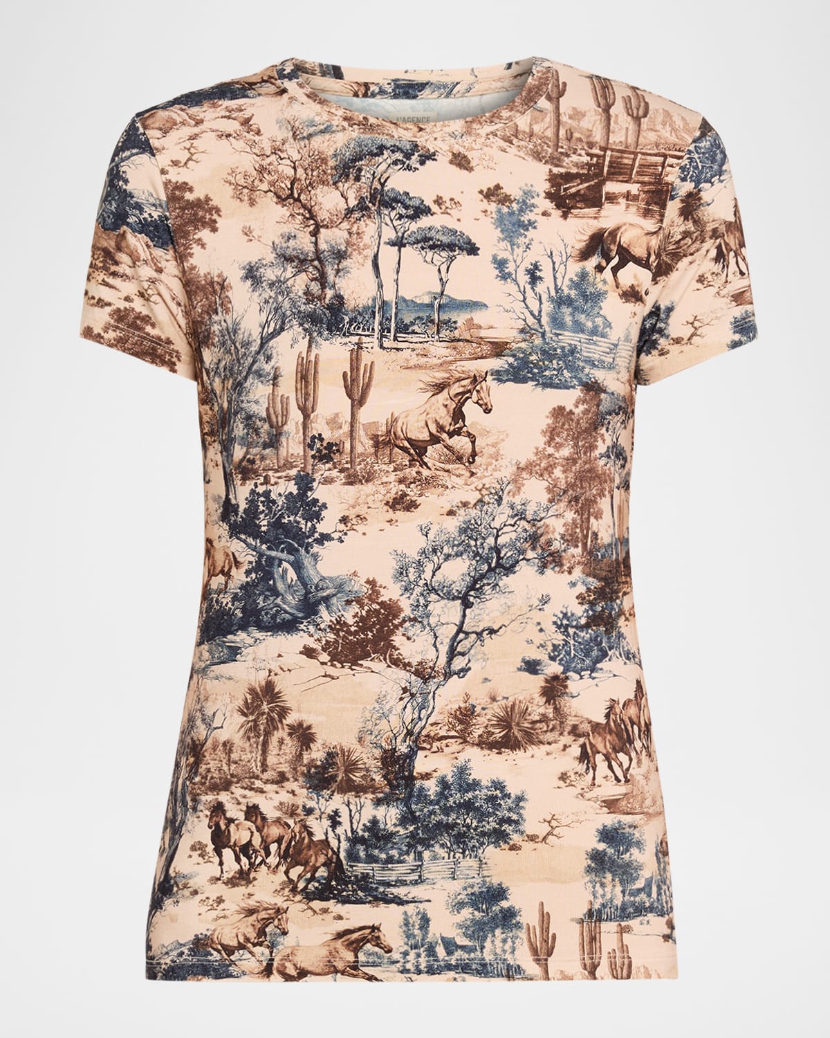 L'Agence "Ressi" classic tee featuring a Western toile motif Crew neckline Short sleeves Fitted silhouette Hem sits at the hip Pullover style Promodal® rayon/Lycra xfit® spandex Made in USA
