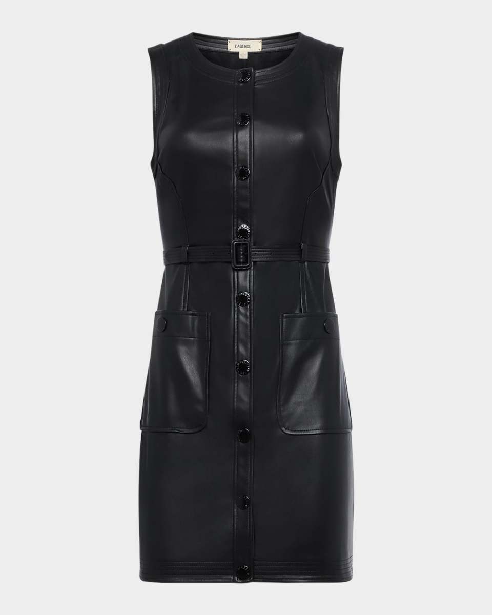 L'Agence "Ronin" sleek faux leather (PU/polyester) dress features flattering seaming and tonal buttons Crew neckline Sleeveless Adjustable belt through belt loops Front patch pockets Hem falls above the knee Bodyskimming fit Button front closure Polyurethane/polyester Dry clean Imported