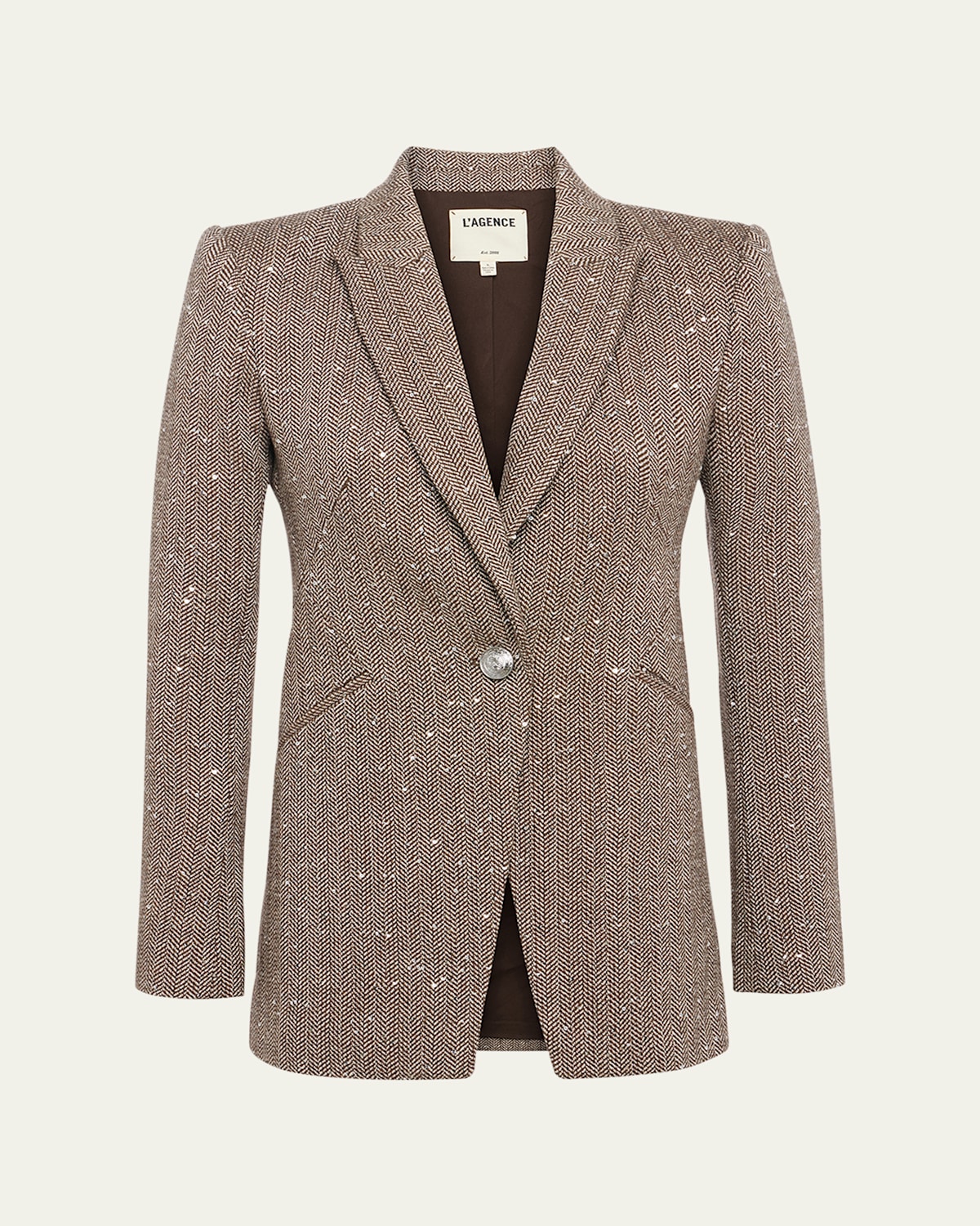 L'Agence "Sheila" structured chevron blazer Peak lapels; singlebreasted front Strong padded shoulders Long sleeves; button cuffs Slanted side pockets Midlength Polyester/wool Dry clean Imported