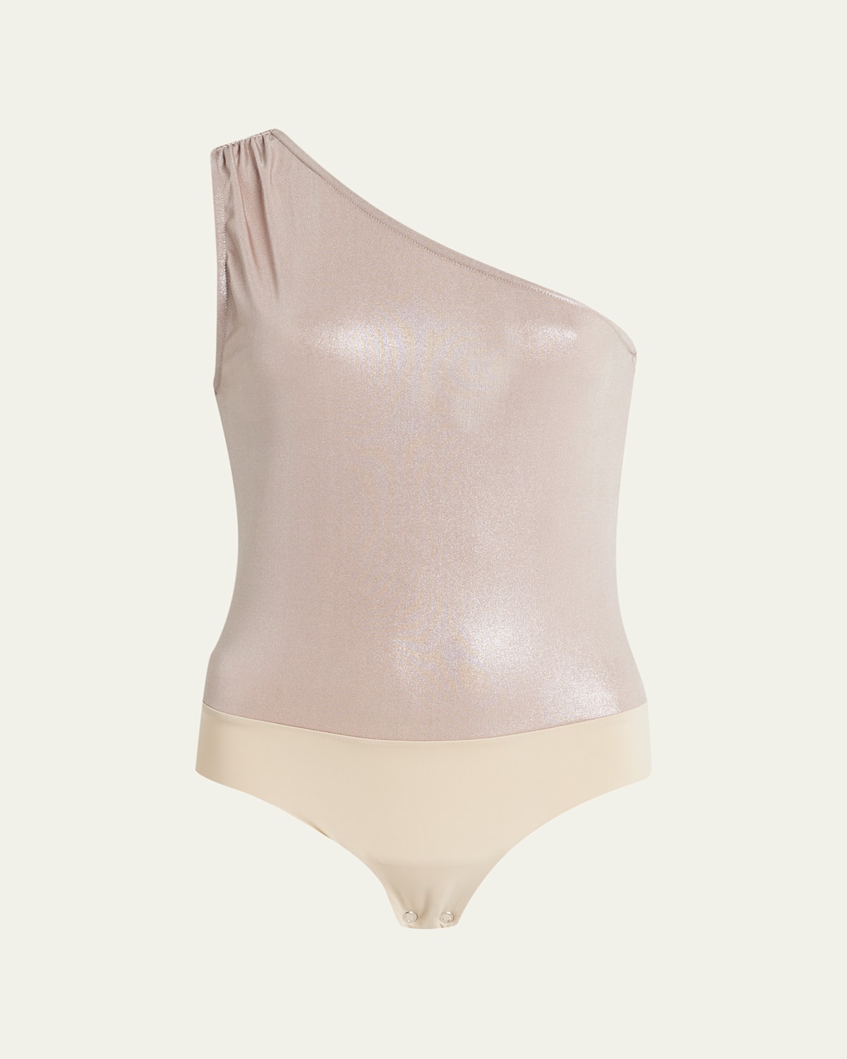 L'Agence "Sheridan" metallic oneshoulder bodysuit with gathered shoulder detailing Sleeveless Slim fit Snapgusset Polyester/spandex Dry clean Made in USA